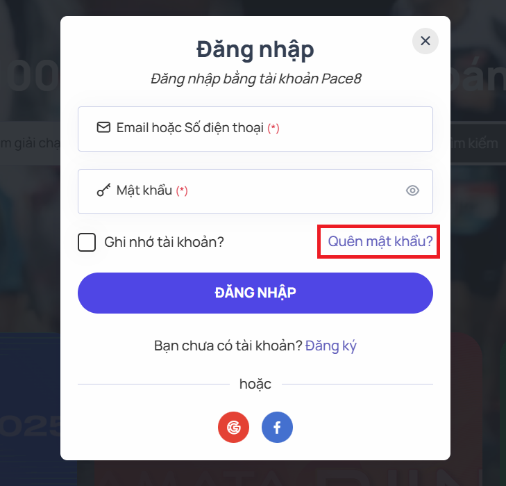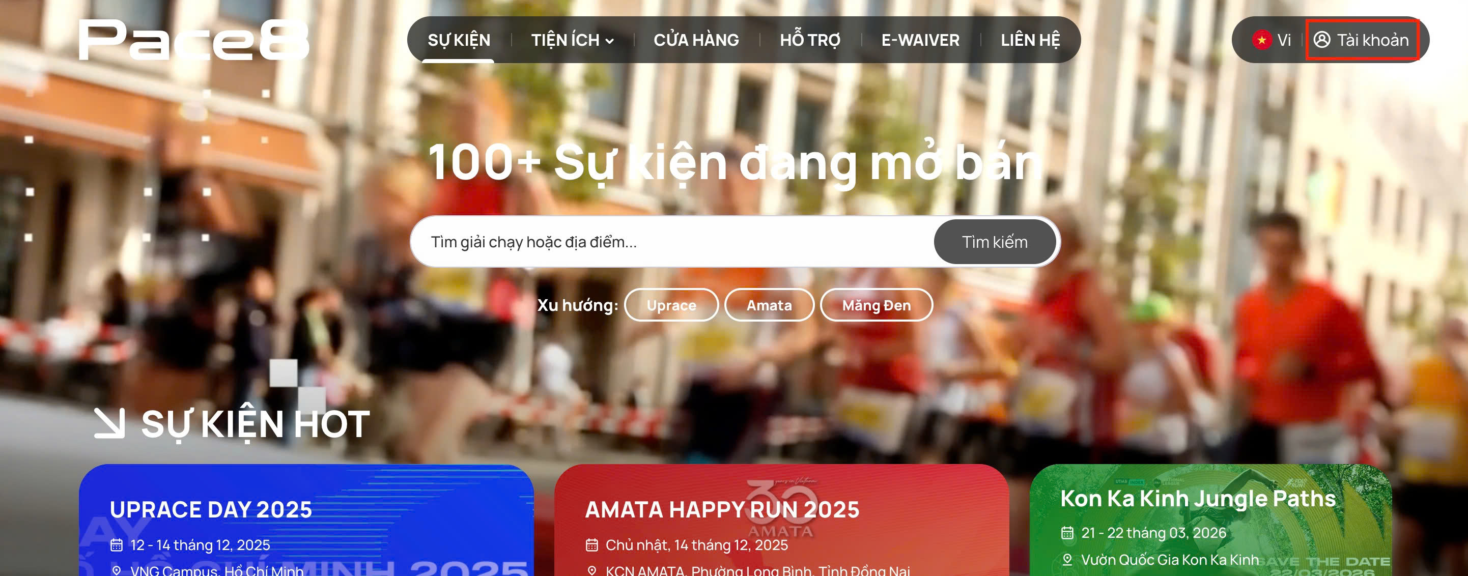 Bước 1: Tại trang chủ Pace8 -> Chọn "Tài khoản" ở góc trên bên phải màn hình hoặc truy cập https://pace8.vn/tai-khoan/quen-mat-khau