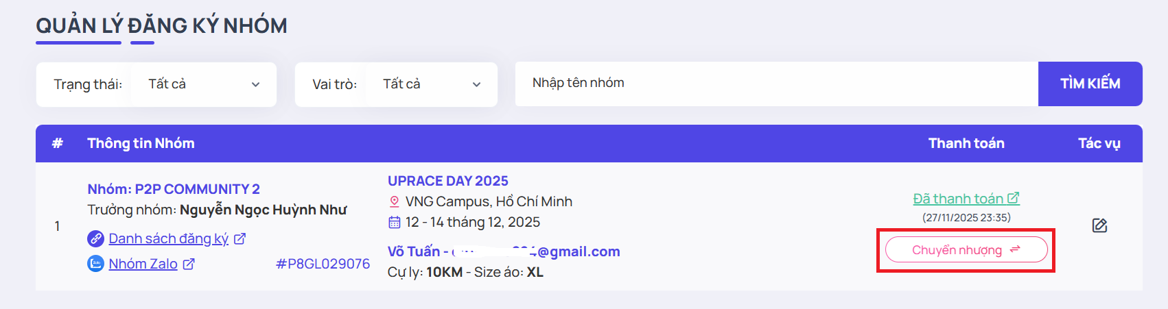Bước 2: Chọn vai trò "Thành viên" -> chọn đăng ký mà bạn cần chuyển nhượng -> nhấn "Chuyển nhượng"