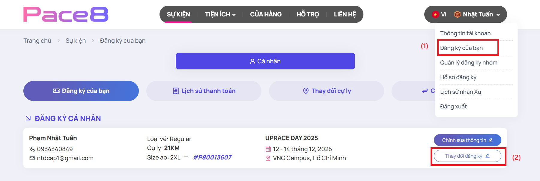 Bước 1: Sau khi đăng nhập vào tài khoản -> chọn mục "Đăng ký của bạn" -> tìm chọn vé muốn chuyển nhượng -> nhấn "Thay đổi đăng ký"