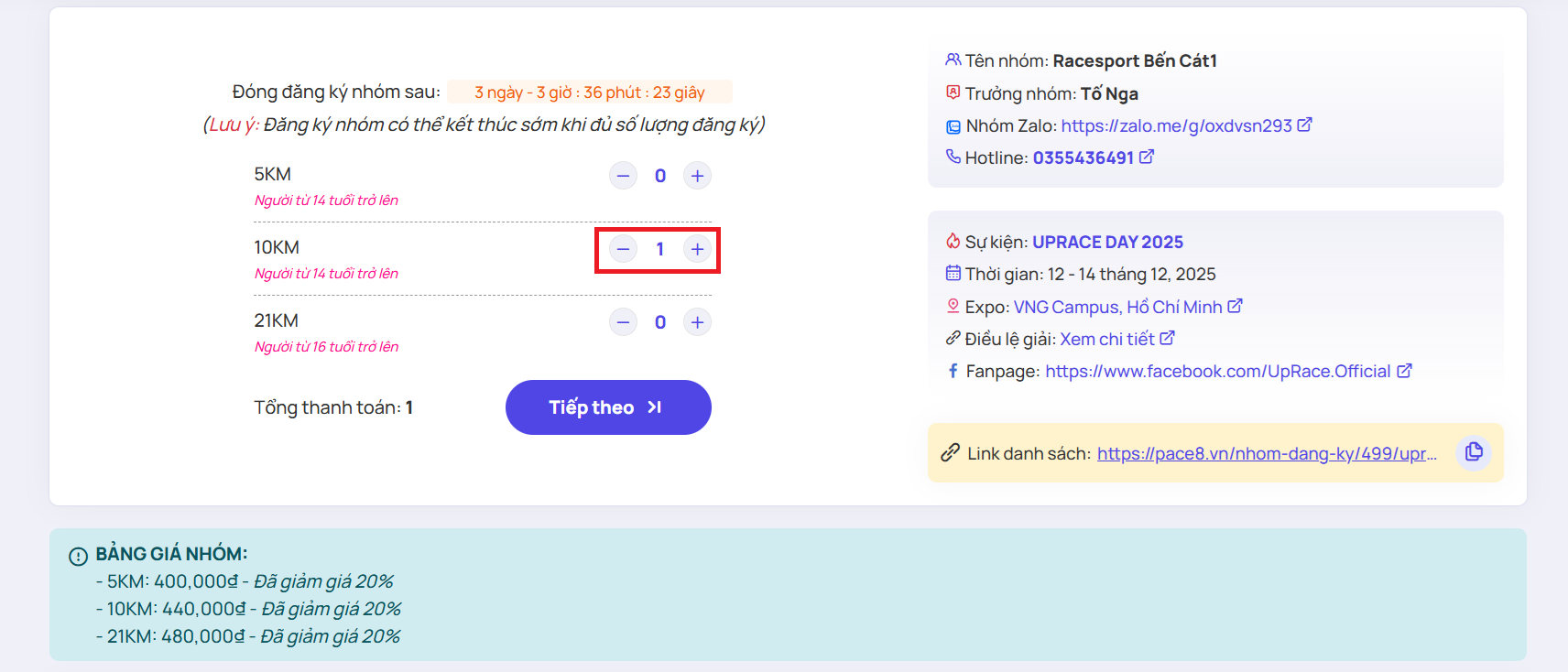 Xem lại thông tin nhóm, thông tin sự kiện, giá nhóm và chọn cự ly và số lượng vé muốn đăng ký -> nhấn "Tiếp theo".