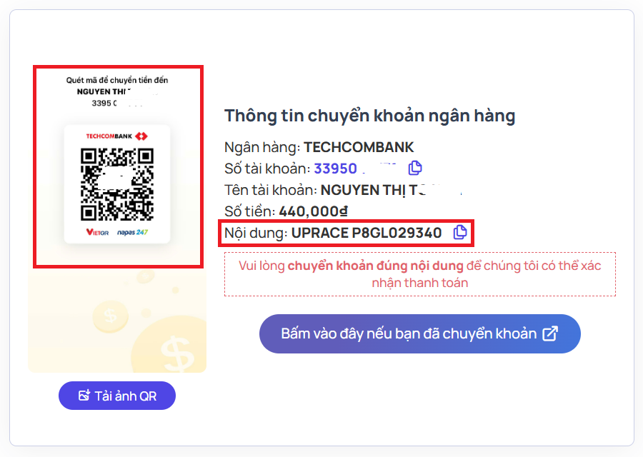 Bước 4: Thanh toán: quét mã QR thanh toán từ ứng dụng ngân hàng hoặc ví điện tử của bạn. Lưu ý, cần chuyển khoản đúng nội dung và số tiền để trưởng nhóm xác nhận thanh toán dễ dàng.
