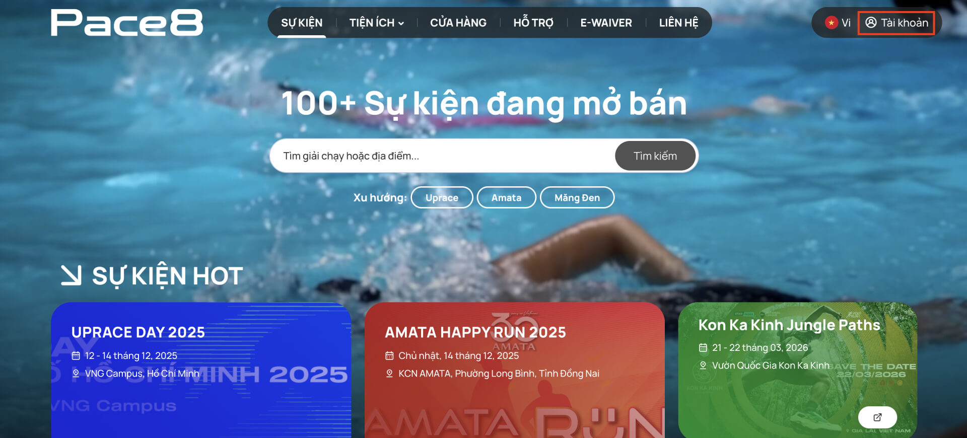 Bước 1: Tại trang chủ Pace8 nhấn vào "Tài khoản" và chọn mục "Bạn chưa có tài khoản? Đăng ký" hoặc truy cập trực tiếp https://pace8.vn/tai-khoan/dang-ky