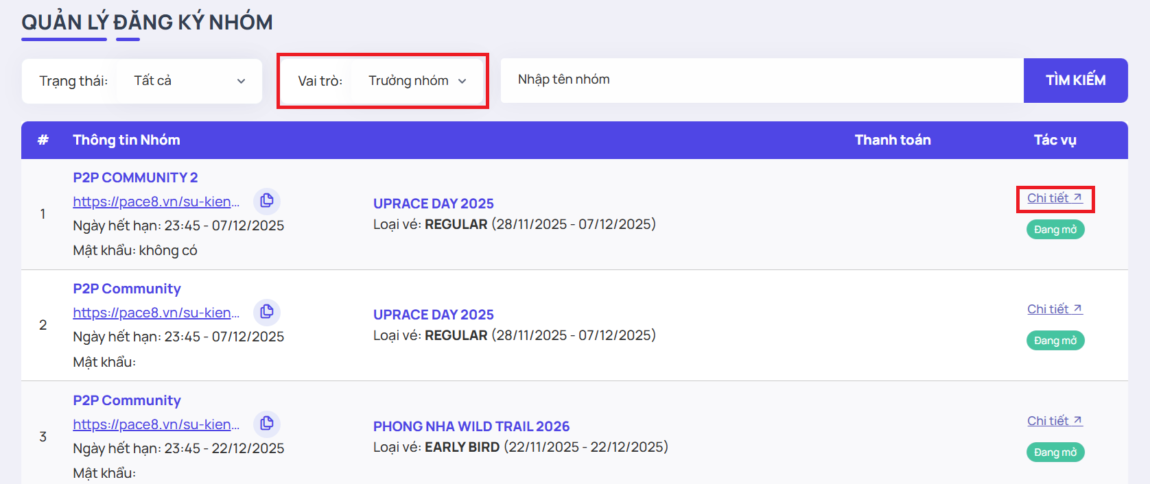 Bước 1: Sau khi đăng nhập vào tài khoản -> chọn mục "Quản lý đăng ký nhóm" -> chọn vai trò "Trưởng nhóm" -> nhấn "Chi tiết"