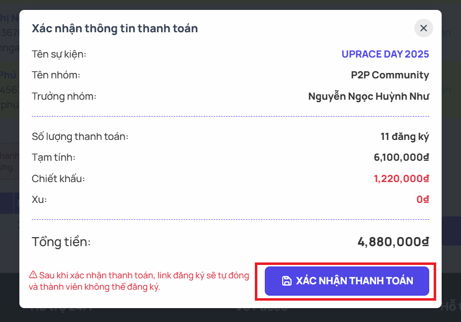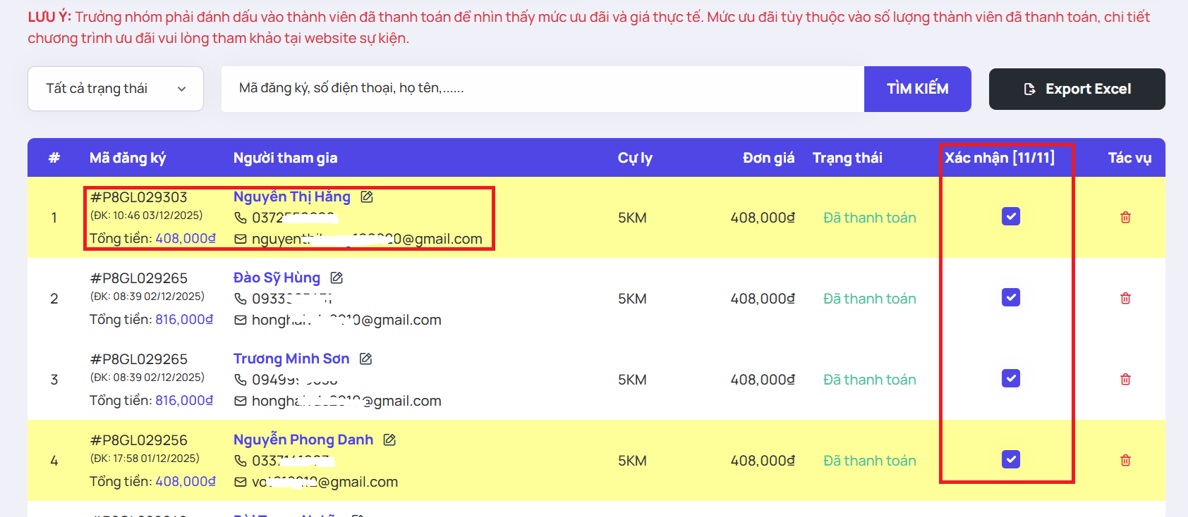 Bước 2: Tại đây hệ thống hiển thị đầy đủ Mã đăng ký, thời gian đăng ký, tổng tiền thanh toán.... Dựa vào thông tin này và đối soát thanh toán để đánh dấu vào ô "Xác nhận" thanh toán cho các thành viên.