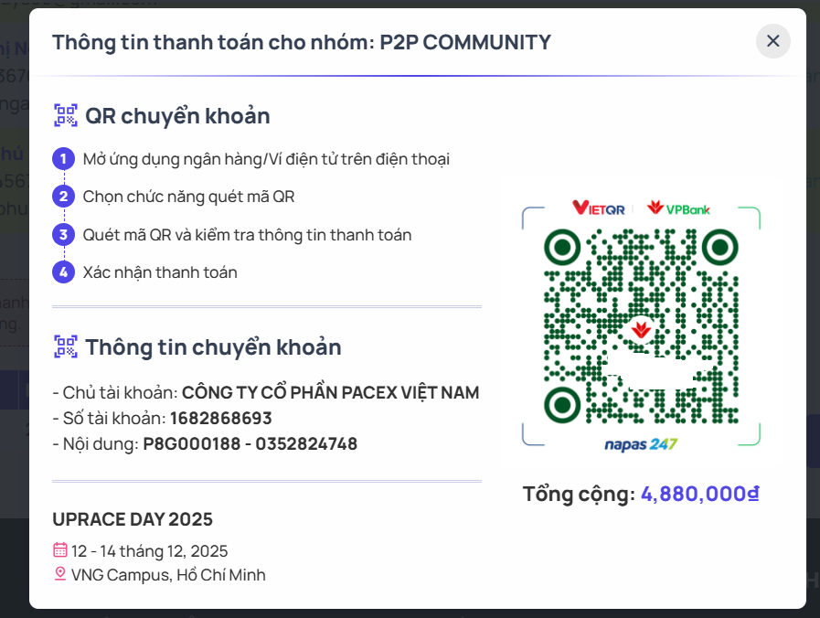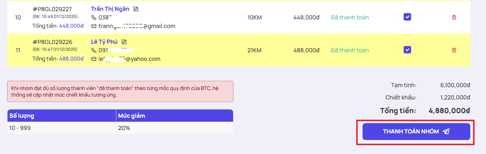 Bước 3: Gửi thanh toán nhóm: sau khi kết thúc gom nhóm, trưởng nhóm nhấn "THANH TOÁN NHÓM" để tiến hành thanh toán về cho Pace8. Lưu ý: mức chiết khấu nhóm thực tế sẽ dựa trên số lượng thành viên đăng ký thành công và chính sách ưu đãi từ BTC.