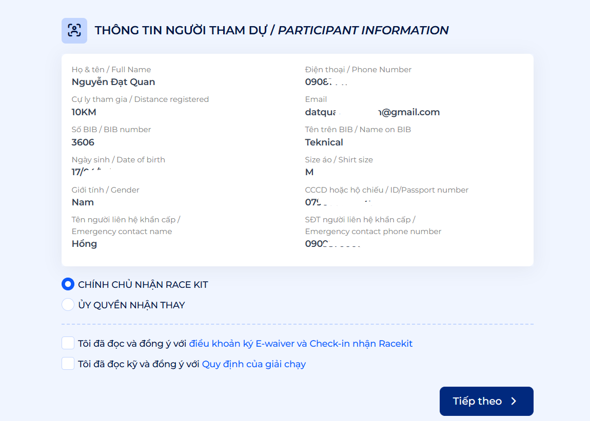 Bước 2: Kiểm tra lại thông tin đăng ký, nếu đã chính xác bạn tích chọn vào 2 ô đồng ý với "Điều khoản ký E-Waiver và Check-in nhận Racekit" và "Quy định của giải chạy" -> Nhấn vào "Tiếp theo"