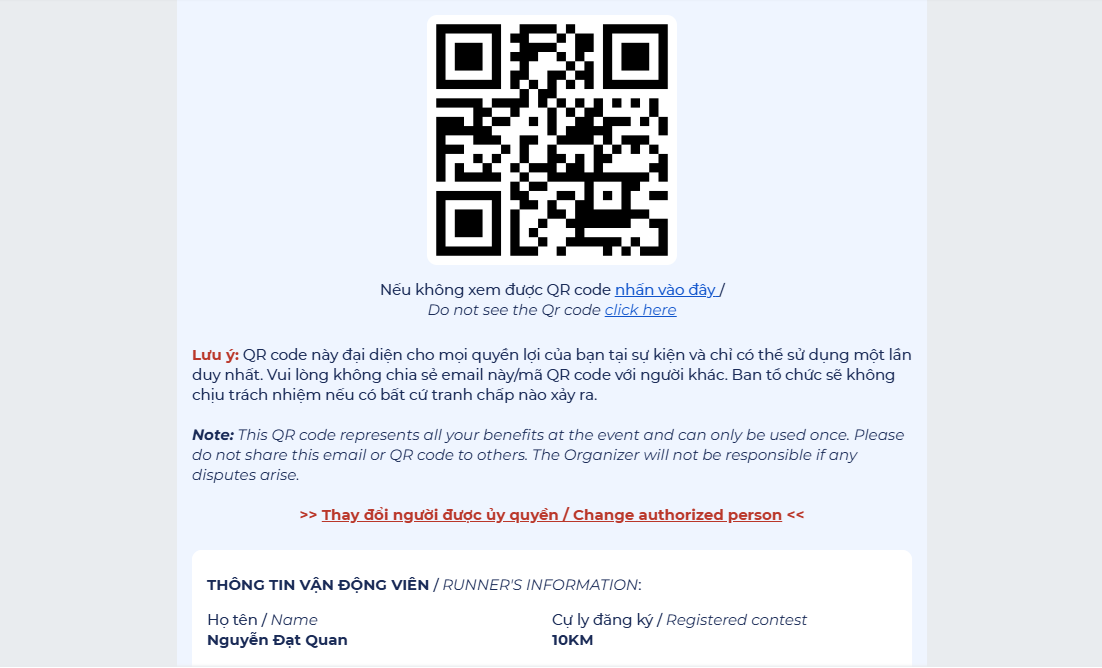 Kiểm tra email của bạn với tiêu đề [TÊN SỰ KIỆN ] Mã QR nhận race kit | QR code for race kit pickup (Tên của bạn) -> lưu lại mã QR Code dùng để checkin nhận racekit vào ngày Expo Day.