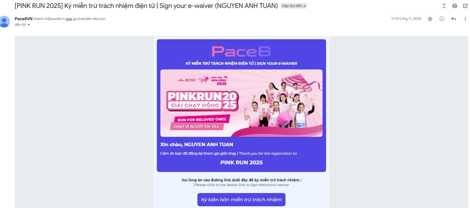 Tìm kiếm email với tiêu đề [Tên sự kiện] Ký miễn trừ trách nhiệm điện tử | Sign your e-waiver (TÊN CỦA BẠN). Mở email và nhấn vào "Ký biên bản miễn trừ trách nhiệm".