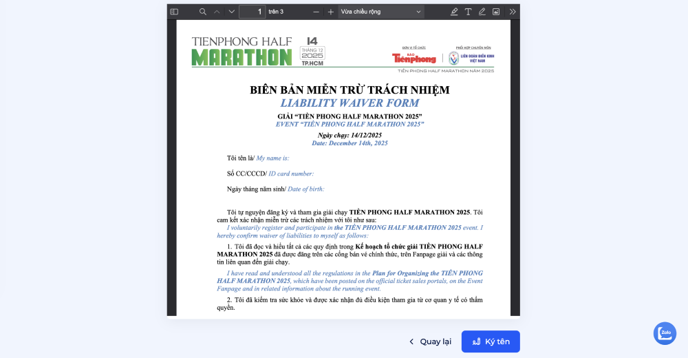 Bước 3: Xem kỹ nội dung biên bản miễn trừ của BTC -> nhấn "Ký tên"