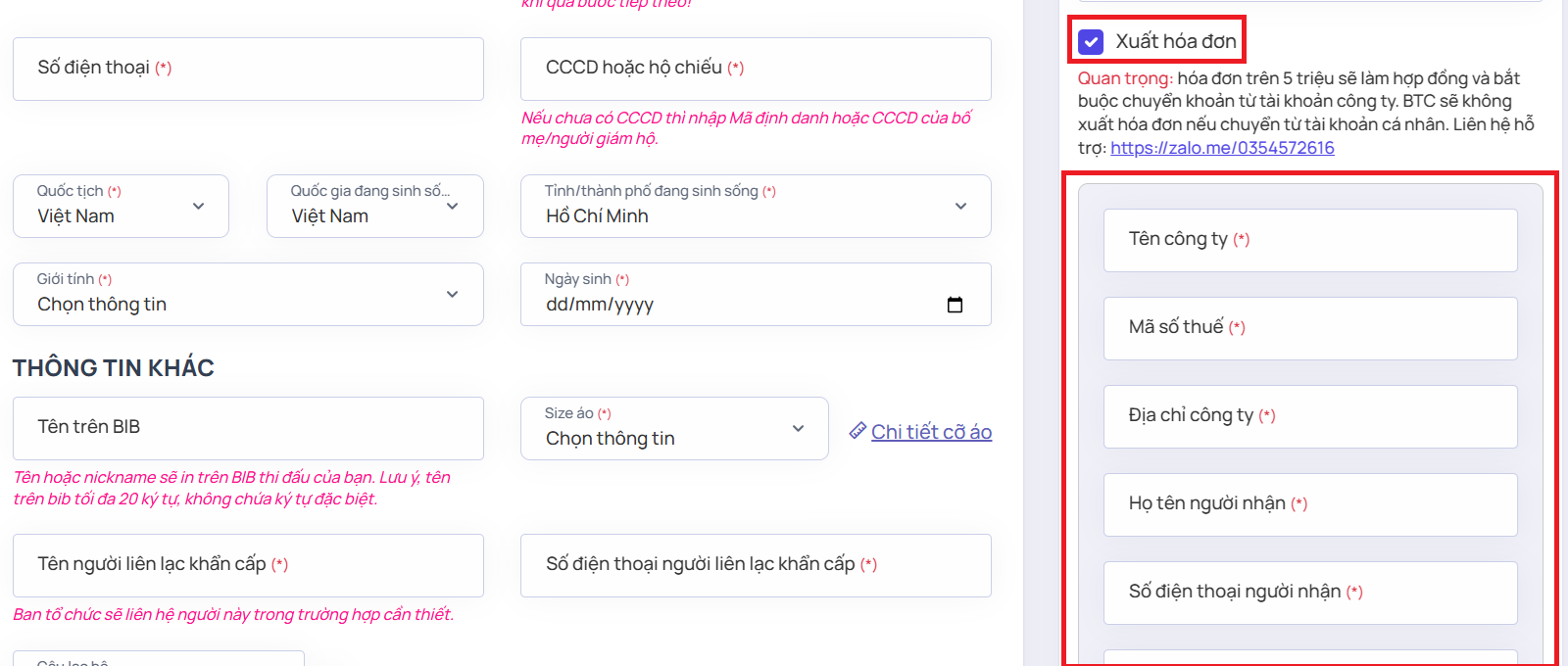 Pace8 có hỗ trợ xuất hóa đơn theo yêu cầu cho các cá nhân hoặc tổ chức mua vé giải chạy. Các bước đăng ký và yêu cầu hóa đơn như sau: